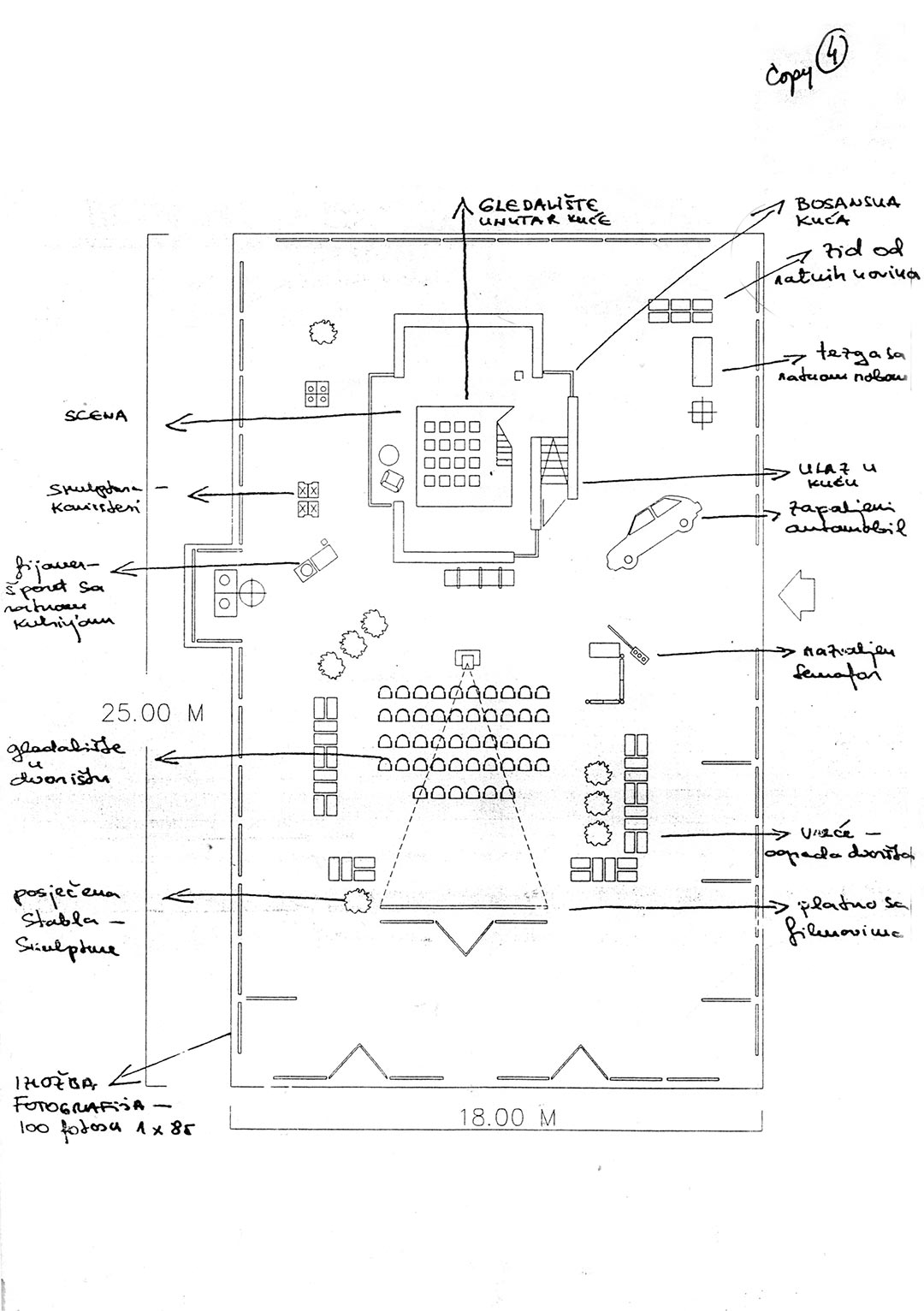 Prof. emeritus Ognjenka Finci: Prihvatila sam se posla i napravila par varijanti mogućeg tlocrta i fasada. Tlocrt je bilo relativno lako definirati kako dimenzijom tako i dispozicijom, jer smo znale da želimo u „bosanskoj kući“ imati prostor gledališta i prostor scene koji omogućava različito korištenje. Sa vizualizacijom fasadama je već bilo teže, nisam mogla, osim prikaza u adekvatnom mjerilu sa definiranim pozicijama prozora, doksata i ulaznih vrata, prikazati njihov realan izgled. On će zavisiti od materijala koji ćemo nalaziti i sukcesivno donositi sa zgarišta i na licu mjesta ukrajati ga i fiksirati na konstrukciju. Fasade sam pokušala prikazala kroz crtež - kolaž, kako bi bar na neki način dočarala izgled te buduće „patchwork fasade“. Eksterijer kuće je kompozicijski i volumetrijski trebao biti „prava“ bosanska kuća sa svim karakterističnim elementima, doksatom, četverovodnim krovom, malim prozorima na čijem su simsu saksije sa procvjetalim muškatlama, a u enterijeru, netipično za bosanske kuće, jedinstven prostor bez zidova. Denivelirali smo pod, tako da se formira prostor gledališta na koti poda i uzdignuti prostor scene čime „bosanska kuća“ gubi svoje očekivane stambene atribute, postaje teatarski prostor koji je trebao poslužiti različitim umjetničkim performansima.