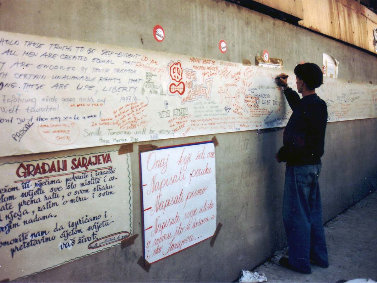Građani ispisuju poruke na zid, Sarajevo 1992-1996. © FAMA Kolekcija - Arhiv fotografija 1992-1996. (Drago Resner)
